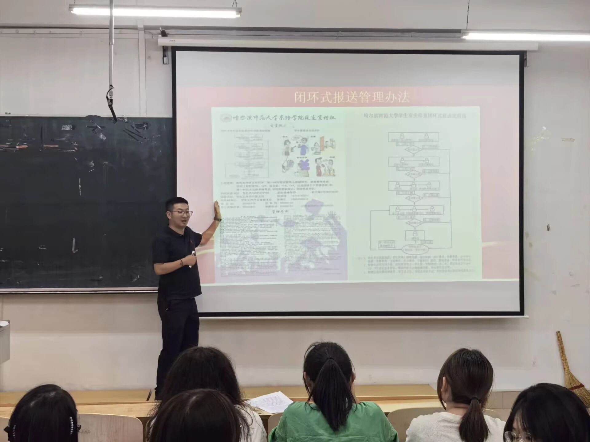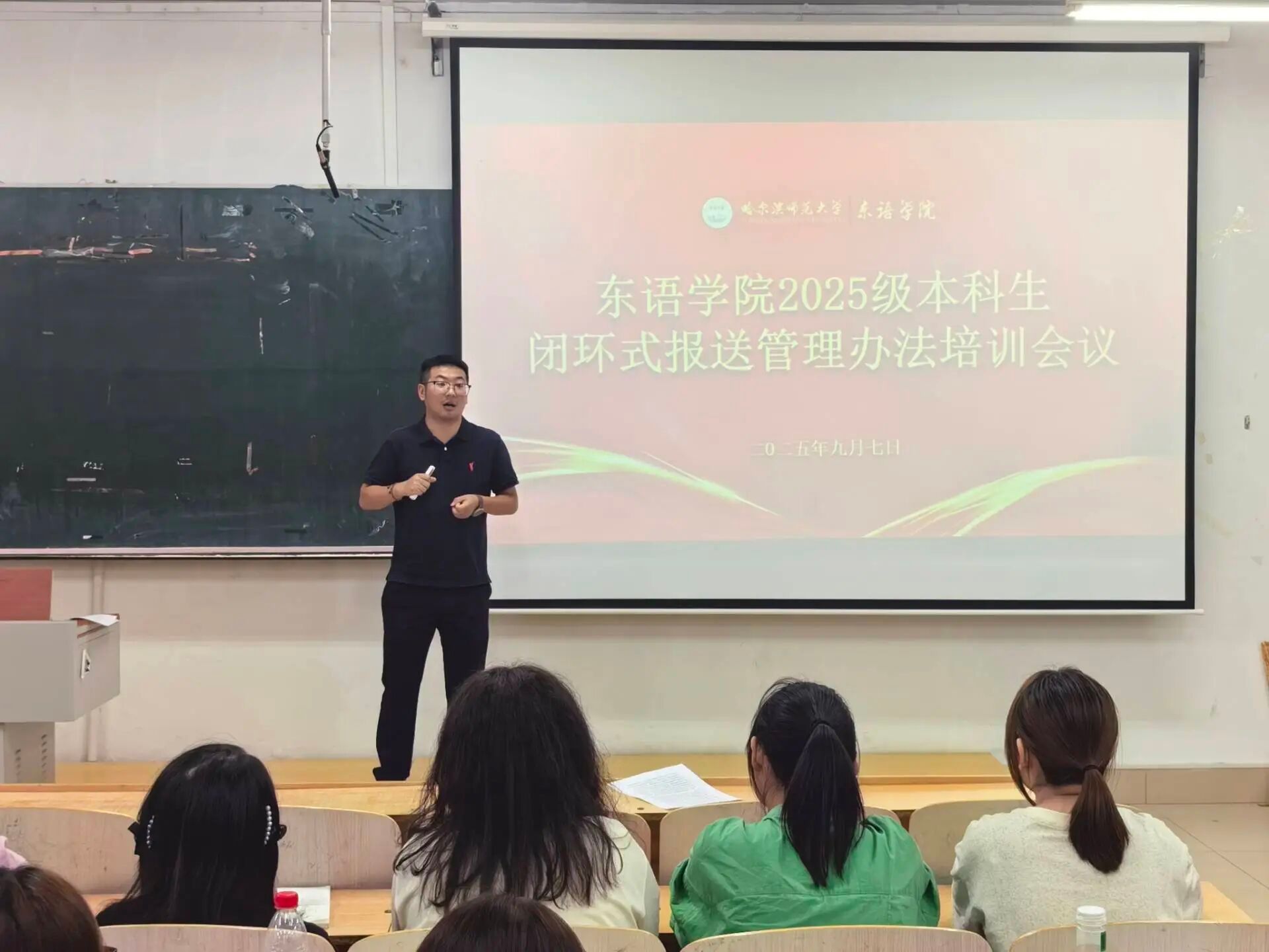 为深入贯彻落实《哈尔滨师范大学学生安全信息闭环式报送管理办法》,切实增强2025级新生的安全意识和自我防护能力,9月7日,东语学院在社科楼452室召开2025级新生安全信息“闭环”管理办法培训暨安全教育大会。学院学工办主任、2025级新生辅导员陈彦伟老师担任主讲,2025级全体新生参会。