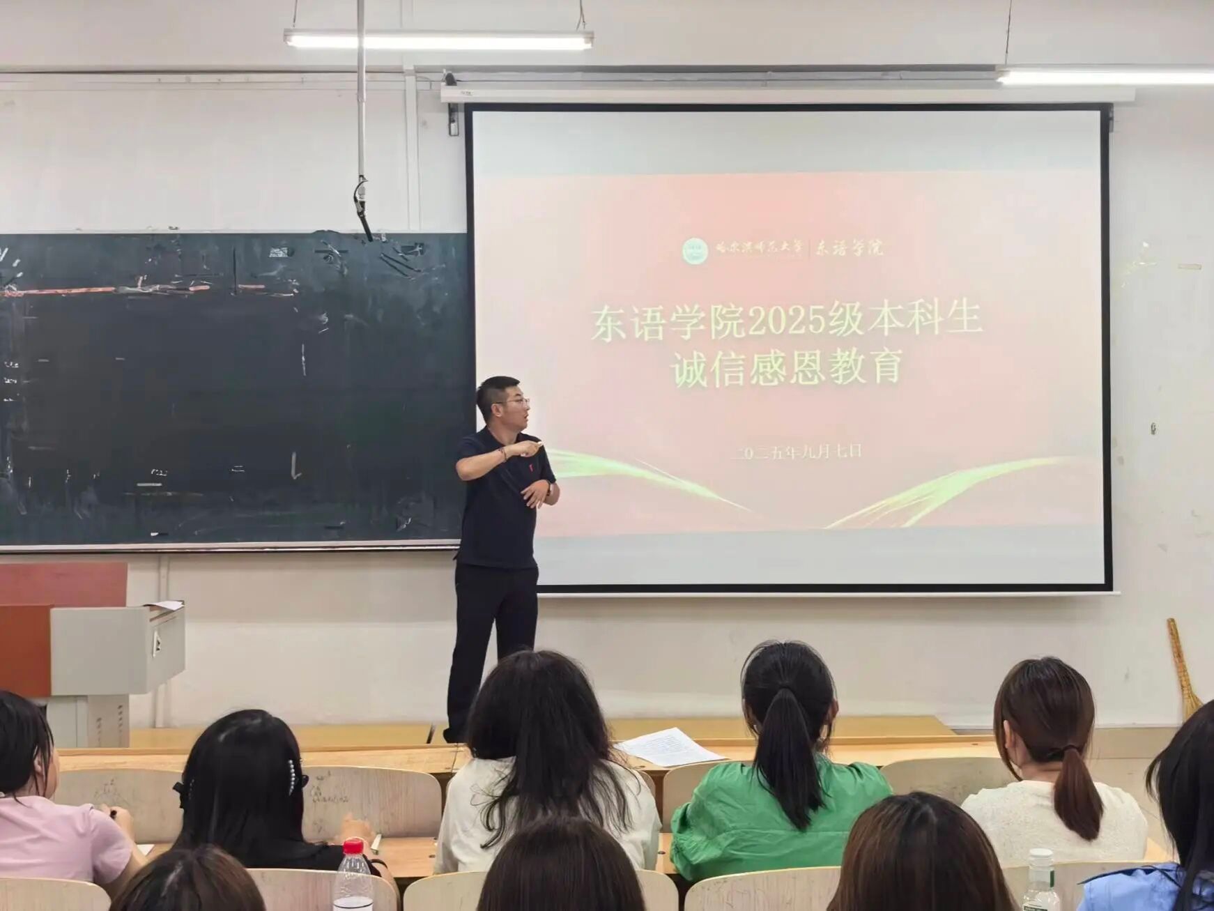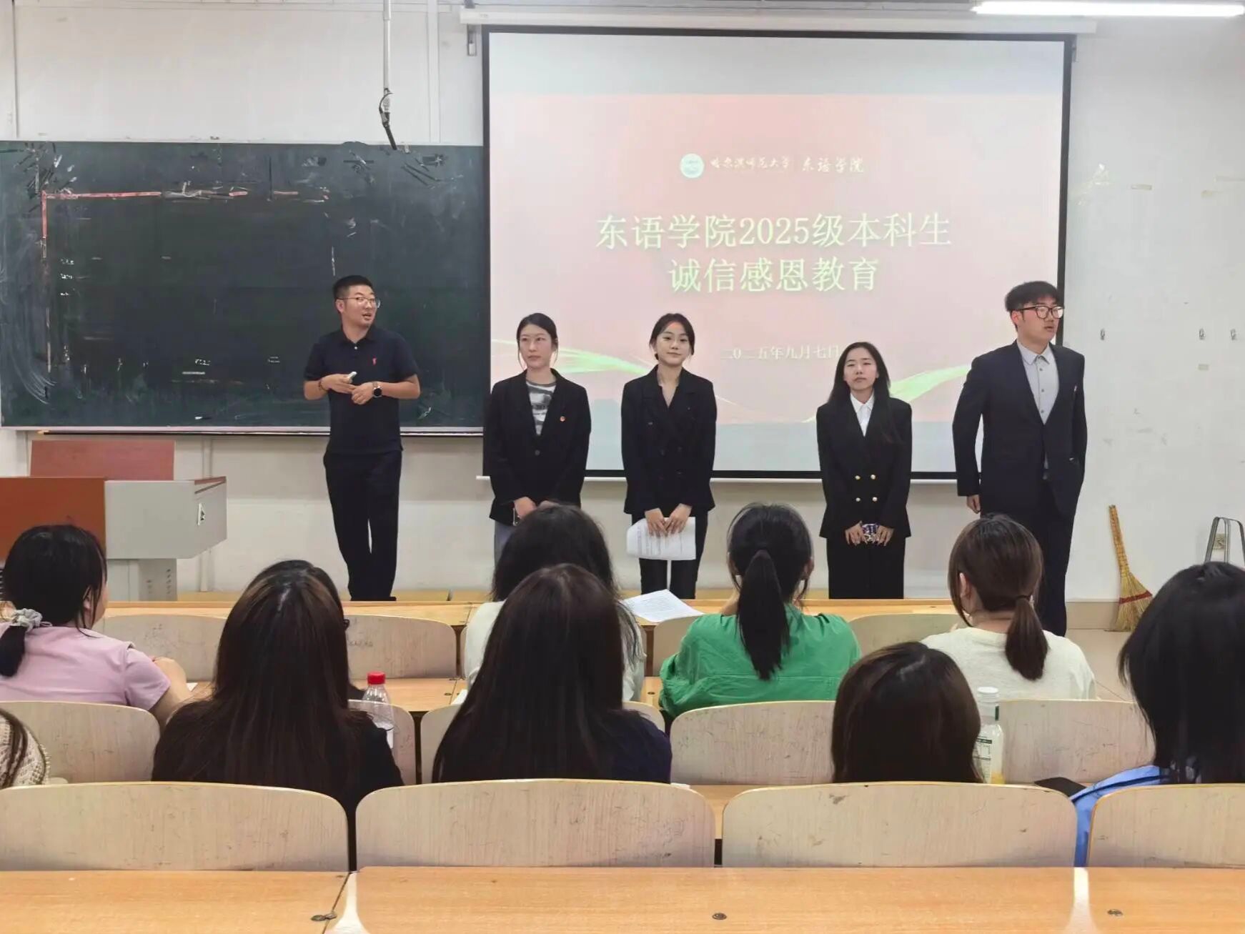 为进一步增强同学们的诚信意识和感恩意识,塑造学生良好的信用品质,营造诚实守信、心怀感恩的校园文化氛围,9月7日,东语学院在社科楼452室开展2025级本科新生诚信感恩教育活动。学工办主任、2025级本科生辅导员陈彦伟担任主讲。2025级全体新生参加活动。