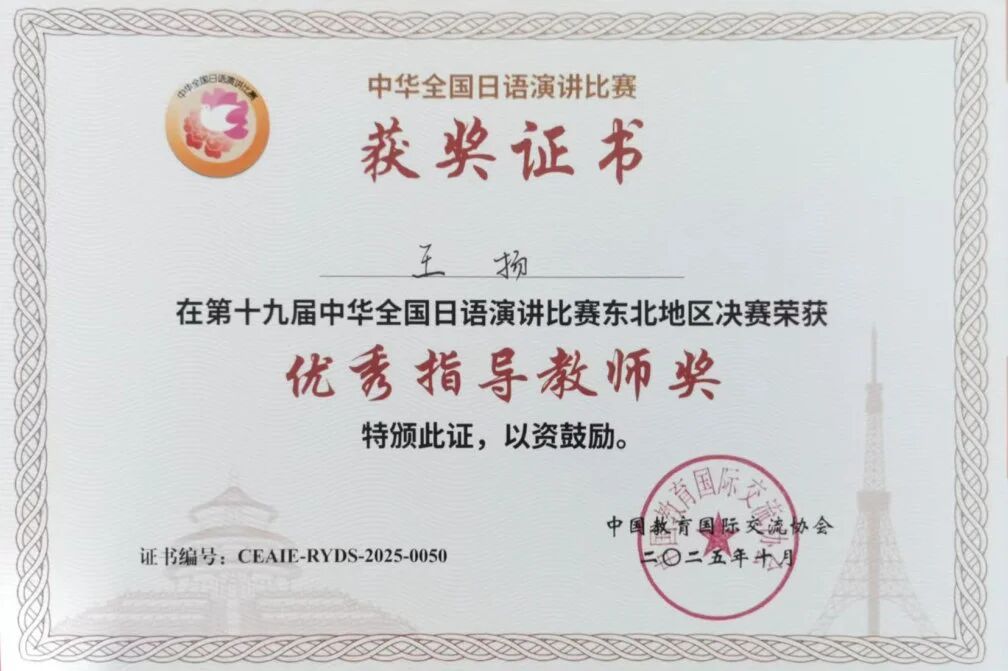 本次大赛吸引了东北地区各大高校在籍本科生共计27名积极参与。比赛设置命题演讲与即兴演讲两大核心环节,从“深度思考”与“临场应变”两个维度,全方位考察选手的日语综合能力。经过比赛角逐,哈尔滨师范大学东语学院2022级本科生姬博文,在日语教师王扬的指导下,荣获比赛三等奖。