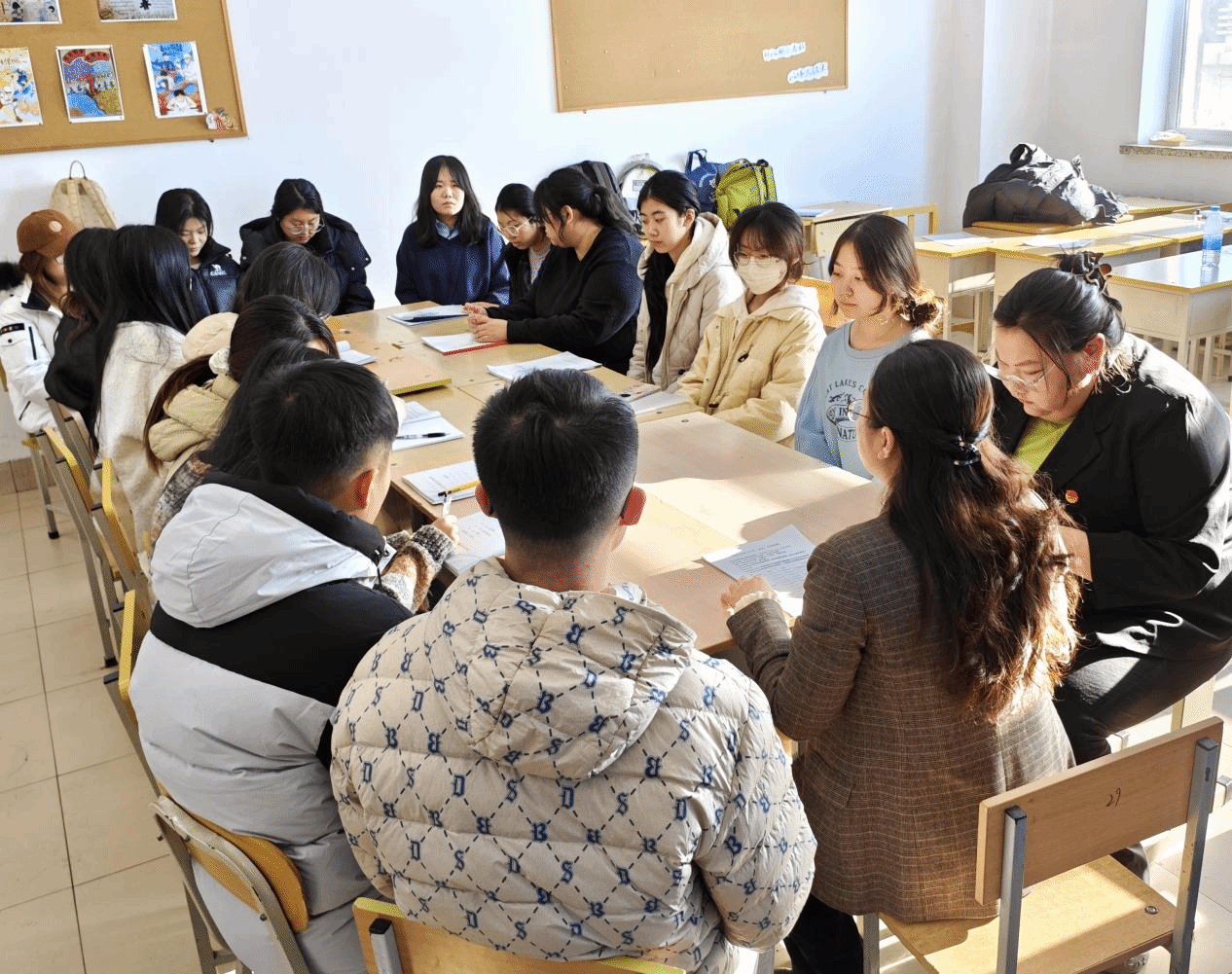 车金善老师带领18名学生,围绕“反思与交流”,通过经验分享、观摩研讨、小组座谈等形式,针对教育实习中的师德体验、教学实践、班级管理、教研工作四个方面,进行了梳理总结与交流探讨,尝试解决实习中遇到的具体问题。